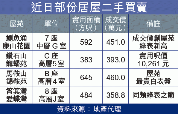 美聯物業徐永成表示,馬鞍山本月至今錄得的90宗買賣中,居屋佔35宗,比例高近四成,破頂價湧現,錦鞍苑B座高層4室,建築面積824方呎,實用645方呎,連地價售460萬元,是屋苑歷來成交金額最貴單位。