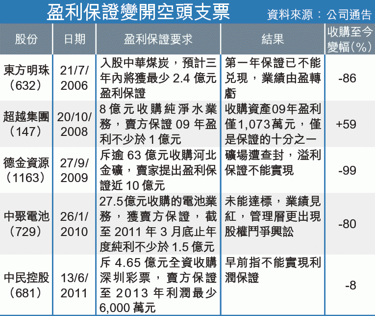 公司收購資產消息每日發生,以為買中好嘢,通常都係「瀨嘢」,尤其賣方拋出「利潤保證」空頭支票條款,股東心諗「執到寶」,殊不知好戲在後頭,金玉其外,敗絮其中。利潤保證條款都有一個先天局限,就是快則一年(慢則三數年)後,始埋單計數,屆時賣方早已「𡁻完鬆」,股價跌八、九成比比皆是。