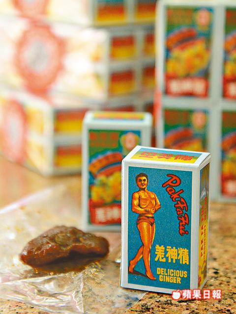 蟠桃菓有一兄弟作,藍盒上大隻佬擺健美甫士……我拿給住澳門幾十年的親戚看,大家頭擰擰說見過未食過,甚至誤讀「羗神精」,呂小姐心水清:「包裝令人以為是男士產品!」但其實是加入陳皮、甘草和檸檬醃製的老羗,上一代人浪漫,覺得辣辣哋可提神,賜名「精神羗」──而講「精神」,誰精神得過大隻佬?於是就出現了一古一今、一陰一陽的「百花魁孖寶」。