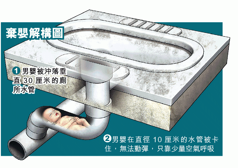 「小心一點,小心一點,夠了,不要鋸了,用鉗子……」上周六(25日)下午,金華區一名住戶在四樓上廁所時,聽到類似貓叫的嬰兒哭聲,於是慌忙報警。消防員到場果然發現一段L形排水管內有個嬰兒頭朝下被卡住,他的兩隻小腳嚴重發紫,幸還活着。消防員落到在三樓,用鋼鋸小心翼翼地拆下整節卡住嬰兒約30厘米高、100厘米長的水管,隨即把水管連嬰兒抬到空曠地方。趕來的救護員嘗試徒手拉他出來,但嬰兒蜷縮在水管,試了幾次都不成功。