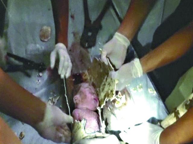 水管內的嬰兒很快被送到浦江人民醫院急診室,由於水管很硬,消防員臨急買來一把長鋼鋸,配合鉗子把水管一片一片夾碎,才把它鋸短。那時大家赫然發現,男嬰連臍帶、胎盤還沒有脫落。20分鐘後,夾住男嬰頭部的管道終於完全剝走,拆開瞬間有人大喊,「還活着」。男嬰的生命力十分頑強,努力地張口呼吸。他臉色慘白、全身赤裸,令很多急診室門外等候的人為之心痛,一旁的醫生趕緊給他輸上氧氣。