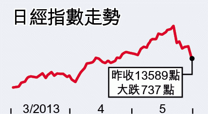 日經指數昨日大插水,收報13589點,埋單計跌5.15%或737點;東證指數亦跌3.77%,至1134點。事實上,日股自上周四因十年期債息升見1厘後,日經指數由五年半高位反覆回落,累積跌幅達13%,技術上大市回落一成已算步入調整期。