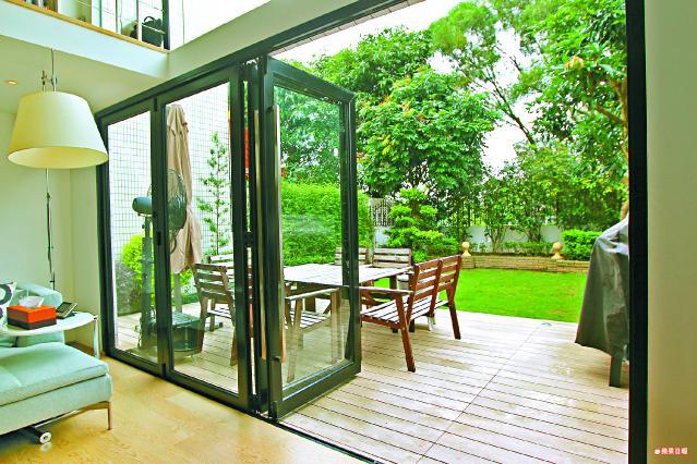 花園900餘方呎,分兩部份,近客廳的鋪戶外木地板及擺放餐枱椅,對開至圍牆種植草坪,周邊栽種高低錯落的樹木,打造優美環境。