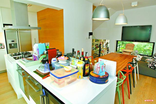 地下客廳四正寬敞,兩壁陳設矮櫃、梳化、茶几、座地電視及地櫃,家具數量雖多,但剩餘空間亦甚寬敞,走道鬆動。一樓飯廳佔半層,毗鄰廚房改開放式,設有island kitchen,連同長形餐枱,共組愜意的用餐區。