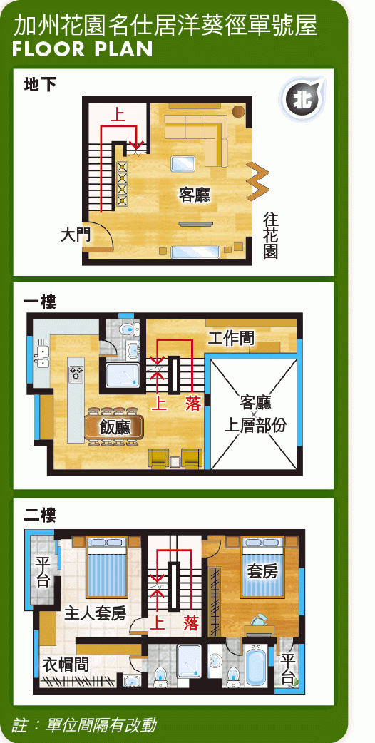 間隔:2套房2廳;另工作間、衣帽間、天台及平台