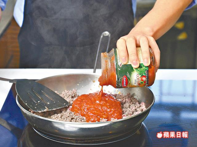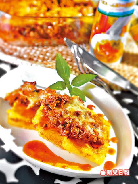 3.另起油鑊,放牛肉煮4至5分鐘,加番茄紫蘇醬、黑椒碎和鹽,煮1至2分鐘至熟透,舀起牛肉及汁料,倒在(2)之粟米粉片上,灑上芝士,放入預熱190℃的焗爐焗20分鐘即可。