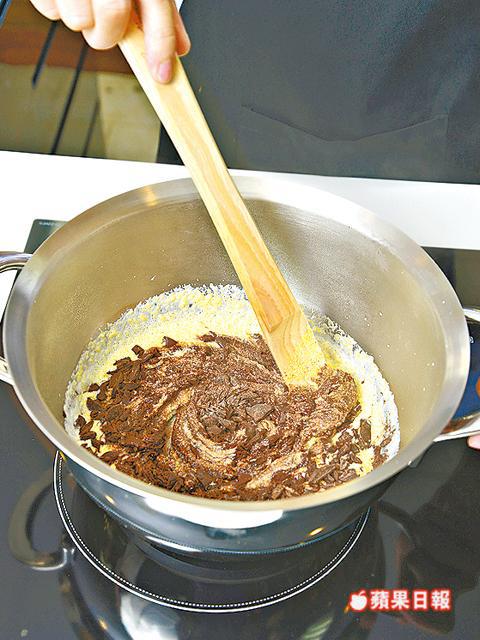 3.放入黑朱古力碎,直到融化即可盛起,放上薄荷葉及士多啤梨片享用。