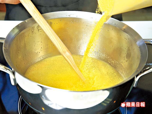 1.水煮沸,加鹽,轉慢火慢慢加入Polenta,用木勺攪拌約5至8分鐘。