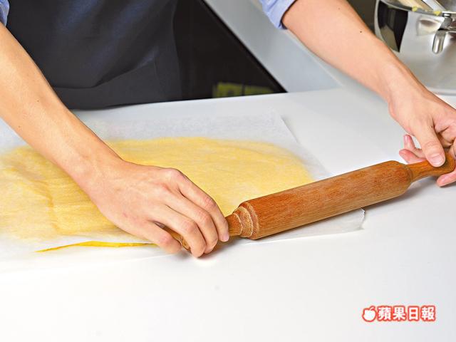 3.蓋上另一張烤焗紙,並用麵粉棍輕輕壓平Polenta。然後揭開紙讓水份揮發約半小時或直至乾身。