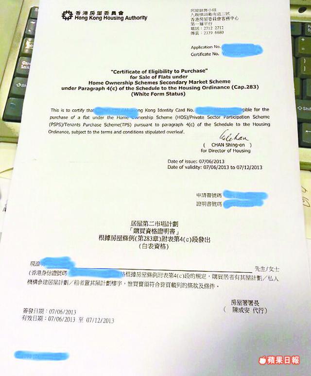 市場原預計首批2,500名白表客最快月中後才收到購買證,但有中籤者昨已收到由房委會發出的「購買資格證明書」,全港首宗白表客入市個案率先在天水圍出現。一名以家庭組合申請免地價買居屋的白表申請者,昨日中午已收到房委會一封掛號信,內附由房委會發出的「購買資格證明書」,簽發日期為6月7日,申請人可即時在居屋第二市場購買心水單位。而有關「購買資格證明書」的有效期為簽發日期起六個月內生效。