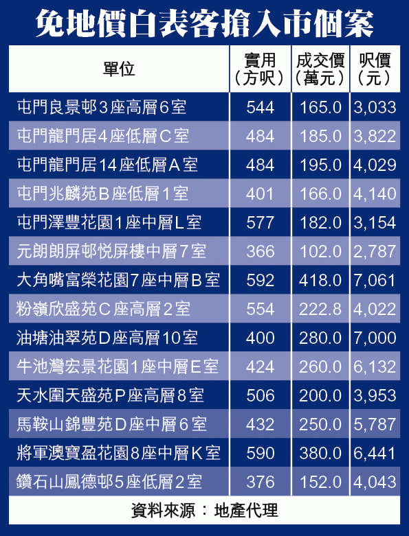【本報訊】各區出現白表免補地價客熱搶上車盤個案。過去3日,市場至少錄15宗白表免補價客買賣,單是屯門區,昨單日至少錄5宗白表客扑鎚衝入市。公屋良景邨更以165萬元成交價登上綠表新高紀錄;同區居屋兆麟苑亦錄破頂價。有單身白表申請人連續5日不停站睇樓,擔心遲買業主反價,索性加碼追入近200萬元的龍門居。