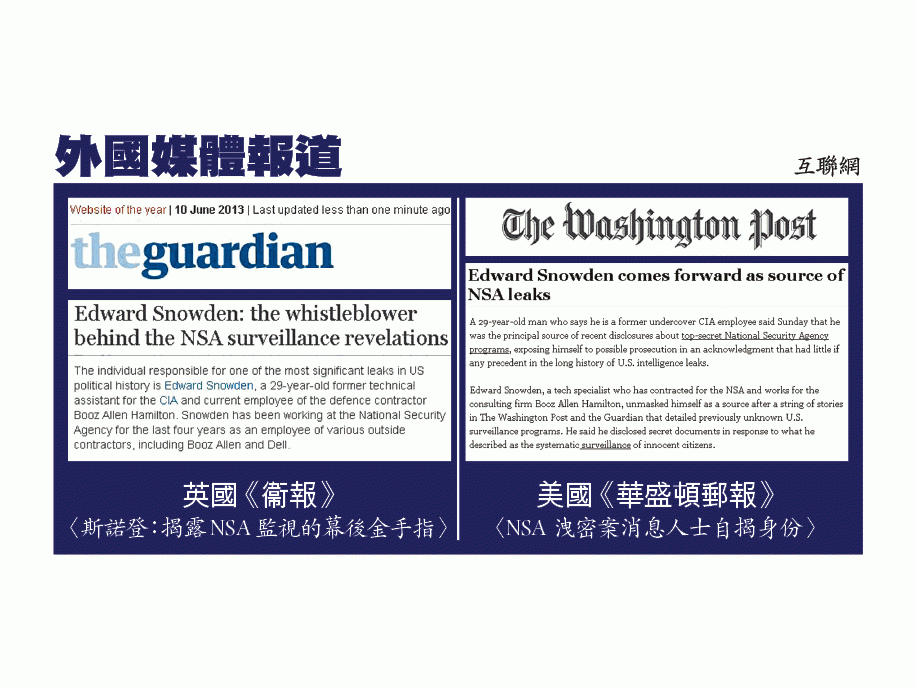 英國《衞報》報道揭發美國政府暗中蒐集民眾電話紀錄及上網資料的金手指自願曝光。曾在中央情報局(CIA)任網絡技術人員的愛德華.斯諾登(Edward Snowden),原來過去三星期一直藏身於香港;他表示,選擇在香港揭露美國政府的所為,是因為香港人堅信言論自由。