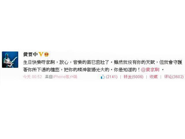 至於曾鬧爆家強惡毒,之後又主動示好的黃貫中(Paul),亦於昨凌晨在微博留言:「生日快樂呀家駒,放心,音樂的苗已茁壯了。雖然我沒有你的天賦,但我會守護着你所下過的種茁,把你的精神發揚光大的。你是知道的!」