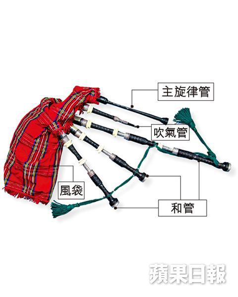 蘇格蘭風笛(Bagpipe)並非源自蘇格蘭,早在十五世紀已經在歐洲各國出現,但風笛已經成為蘇格蘭標誌,在葬禮、節日等場合都會聽到蘇格蘭人演奏風笛。結構上,風笛有吹氣管、風袋、三支和管和一支主旋律管子,演奏時,風袋置於肋骨下,通過吹氣管向風袋注入空氣。風笛手用肘部擠壓風袋,和管和主旋律管子發出聲音。