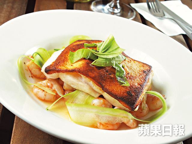 4.焗魚同時,另起鑊,下油,把蝦仁炒熟,下鹽、黑椒和煙熏味辣汁調味,先盛碟上。放上魚多士,再刨入青瓜片,和加上羅勒葉即成。