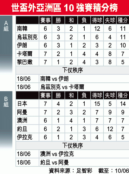 世盃外亞洲區10強賽來到尾2一輪,除了日本提早出線外,其他強隊的形勢都未明朗。