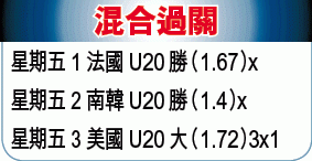 2013年世青盃周五在土耳其揭幕,A組首戰由法國U20對加納U20,可望小勝,捧主W。(球賽編號:星期五1;無綫網絡電視02及now810台今日11:00pm直播)