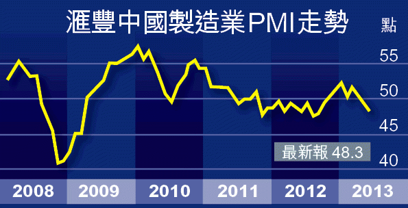 滙豐PMI指數,繼5月份由升轉跌至49.2後,6月份進一步擴大跌幅至48.3,是九個月以來新低,亦比預測平均值為49.1更差。滙豐報告指,製造業收縮幅度比外界預期更差,產出數值為48.8,創下八個月來新低。各細項包括產出、新定單、就業、採購數量等皆進一步萎縮。新出口定單降至44,是2009年3月金融海嘯以來的最低值,拖累整體PMI指數回落。
