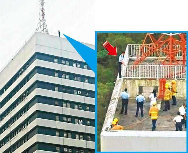 【本報訊】馬鞍山警署一名健康有問題需長期請病假的37歲姓吳、渾號「4夫」的軍裝警員(PC),昨午5時許,他接獲通知因病假已超支要扣工資,遂返回警署交涉不果,竟穿上警服後走上天台,危站圍欄外邊緣企圖跳下,並致電家人報警,上級及同袍獲悉上天台勸解,消防員在地面張開救生氣墊及在天台縋繩戒備,經半小時游說,事主受勸返回安全地方,送院檢驗。