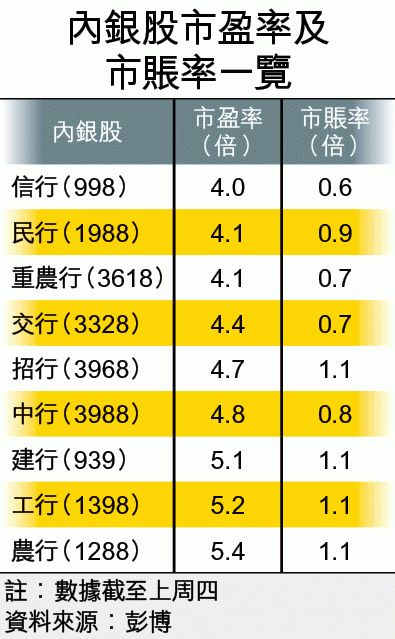 根據彭博資料顯示,現時在港上市九家內銀股,市盈率介乎4倍至5.4倍,市賬率則為0.64倍至1.14倍,與過去三年平均數比較,折讓幅度動輒兩成,名副其實平到笑,當中又以招商銀行(3968)折讓逾四成最誇張。