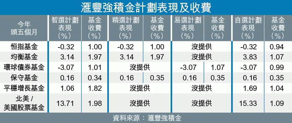 另一個更犯賤的地方,明明基金名稱一樣、組合大致相同,不同計劃下,收費卻有天淵之別。以恒指基金為例,自選、智選及精選今年頭五個月皆微跌0.3%,但前者收費0.94%,後兩者收1%。同為平穩增長基金,智選表現差(1.06%)、收費貴(1.82%),自選則表現佳(1.69%)、收費低(1.04%)。