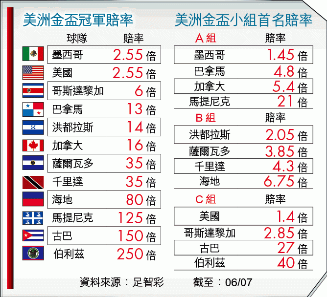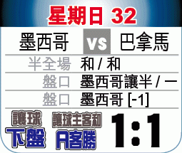 美洲金盃周日開鑼,力爭3連霸的墨西哥在A組出擊,面對黑馬分子巴拿馬。不過,今屆墨軍用二線兵出戰,實力差一截;而且巴拿馬近屆分組賽成績不俗,加上對賽往績不落下風,在老墨讓半/一下,必捧巴拿馬下盤!(球賽編號:星期日32;有線61及201台明日8:00am直播)