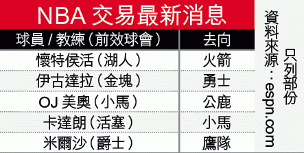 懷特侯活去季加盟湖人,表現一般,惹來各界抨擊,他亦多次暗示若得不到總冠軍,會在自由身市場重開後再次轉會。過去一星期,懷特侯活已與火箭、鷹隊、勇士及小馬的代表會面,最終火箭跑出,獲得該名27歲「聯盟第一中鋒」的芳心。
