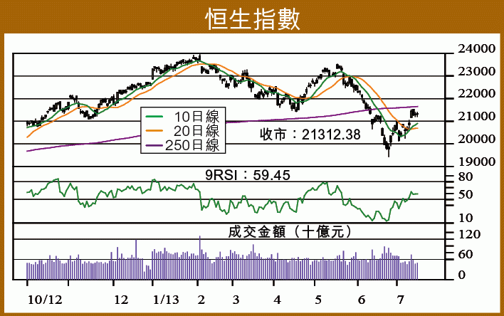恒指連續兩日在21300水平收十字星,而且成交不足500億元,屬待變格局,近日雖呈整固,始終未有回補上周四之上升裂口(21044至21177),反映好友佔上風,10日線(20897)升近裂口底部,縱有調整料可守穩,加上技術指標偏好,MACD保持牛差,9 RSI站穩中軸,整固後有利挑戰250日線(21649)阻力。H指收9419,跌26點,日線圖收鎚頭,W底形態未破壞,10日線(9231)今日將升越20日線(9239)出現黃金交叉,量度升幅為10000關,50日線(10113)逐步回落至該關口,若今次只是中線弱勢下的反彈,應不易站穩。