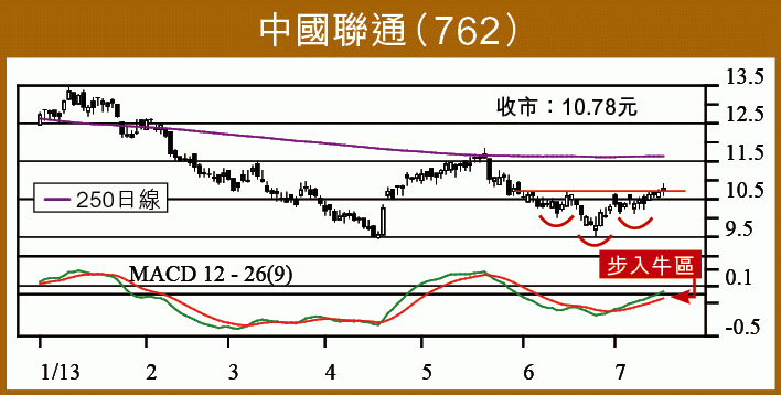 前日推介的中國電力(2380)終於發力,昨升4.3%,證明有勢股只要耐心持有不難獲利。今日介紹剛現利好形態的中國聯通(762),昨升0.9%,收報10.78元。聯通年初自13元回落,4月中曾低見9.31元,反彈回升至250日線受阻再回落至10元之下再反彈,並營造小型頭肩底形態,昨日成功突破頭肩底頸線,確認形態,10日線升破20日線後,進一步升近100日線,MACD開始步入牛區,可於10.80元之下買入,短炒目標250日線(11.51元),即頭肩底量度升幅及5月阻力,失守10.58元止蝕。