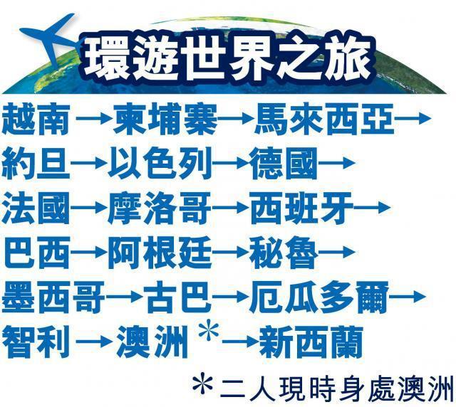 今年1月結婚後,他們已籌備4月出發。「我哋趁後生、未有小朋友,仲有力氣走動,應該做自己喜歡嘅事,點解唔孭着背囊,嚟一次轟轟烈烈嘅環球之旅?睇吓呢個世界呢?」他們希望走遍亞洲、歐洲及南美洲等18個國家,包括越南、柬埔寨、德國、法國、西班牙、巴西、約旦、智利、澳洲及墨西哥等地。