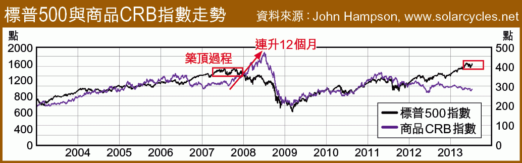 第二,2007年美股見頂前夕,股市大幅跑贏商品,但美股見頂後商品繼續上升12個月,反客為主,見附圖。