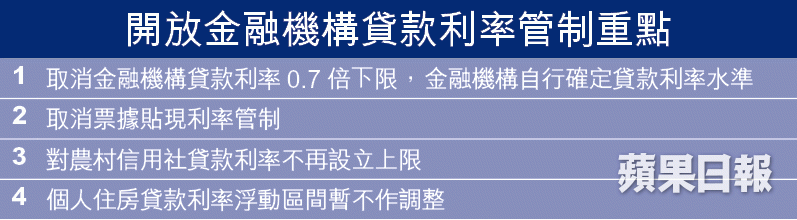 人行在官方網站發佈的答問環節指出,是次全面開放貸款利率管制,可以促進金融機構差異化定價策略,降低企業融資成本,提高小微企信貸空間。