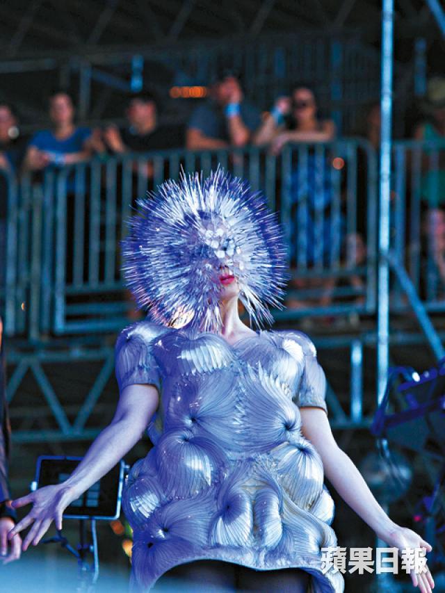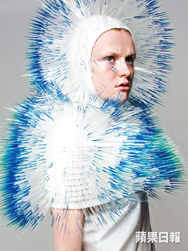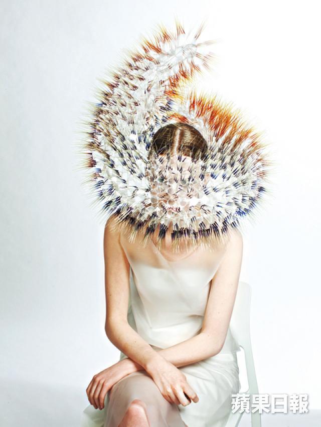 帽子界,比較為人熟識的離不開Stephen Jones和Philip Treacy,都是來自倫敦的Milliner。近日留意到殿堂級冰島女歌手Björk登台時戴了一款很突出的頭飾,終於讓我找到帽壇新血了!來自東京的Maiko Takeda做出來的《Atmospheric Reentry》,剛被Björk選中出戰Biophilia Tour的頭飾,才是Maiko在皇家藝術學院的畢業作,前途無可限量。《Atmospheric Reentry》這個系列靈感來自60年代前衞歌劇作品《Einstein On The Beach》,她嘗試做出一個人在煙霧裏或雲朵裏的效果。經過無數的實驗, 最後為了達到一個分層光環的視覺效果,她選用了Acetate film,先在家打印在膠片上,再印出來,砌成想要的形狀。她試着不同的大少比例、顏色,再用金屬做出底層結構。結果,頭飾作品很多都是全罩式的,質感有點像孔雀毛。