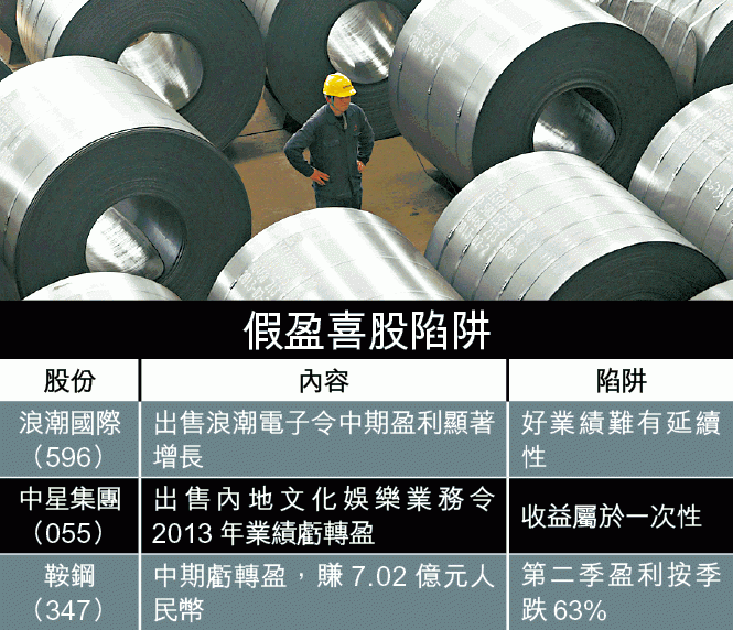 盈喜股其實有不少隱藏陷阱,其一是表面盈利增長,實質倒退,鞍鋼(347)就屬此類。該股於7月12日發盈喜,預期中期業務虧轉盈,由去年虧損19.76億元人民幣,轉賺7.02億元人民幣,但該股首季盈利5.13億元人民幣,即第二季實際只賺1.89億元,按季倒退63%。在產能過剩陰霾及中央未擬放水谷基建下,鋼鐵需求恐難恢復,提防鞍鋼業績繼續轉差。