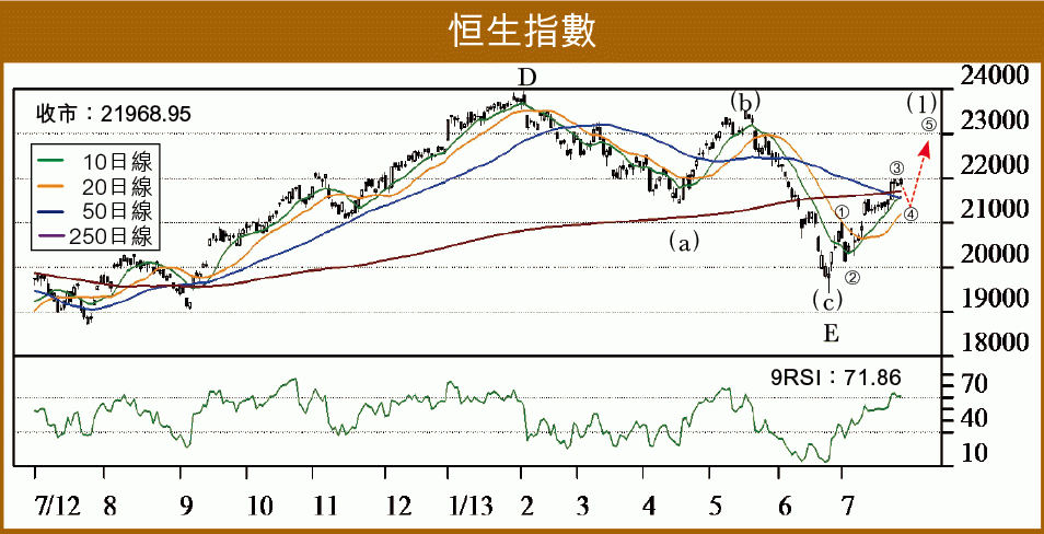 短期升浪持續。(一)最樂觀模式:恒指19426及H指8641為2007年10月巨浪III見頂後,以「三角形」模式運行的巨浪IV大浪E的中浪(C)低位,亦即整個巨浪IV整固已完成,開展巨浪V的大浪1的中浪(1)上升,目前已升抵初步目標恒指22000(H指仍未扺10300),略整固後,恒指有力再上22500/22600(H指仍以10200/10300為目標)。