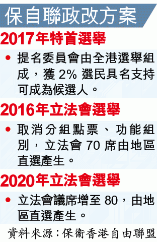 保自聯昨拋出雙普選方案讓公眾討論,建議2017年特首普選的提名委員會由全港選民組成,只要取得2%選民具名支持,就可成為候選人。立法會選舉方面,聯盟認為2016年就要取消分組點票及功能組別,70名議員全由地區直選產生,及至2020年將議席增至80個。
