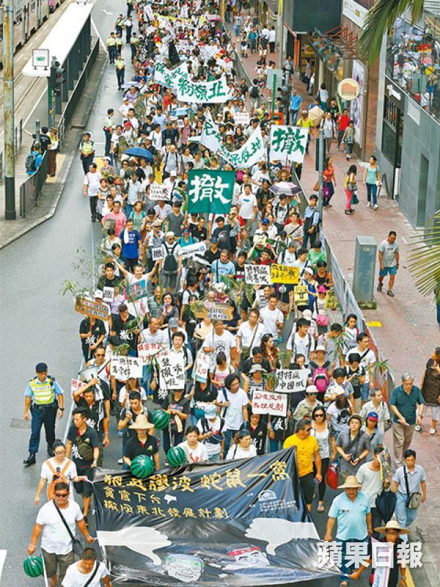 民陣和新界東北三區居民發起的遊行昨午3時許從銅鑼灣東角道出發。民陣稱約3,000人參與,警方指高𥧌期有2,100人。遊行人士沿途高呼:「狼英謬波,蛇鼠一窩,貪官下台」;舉起橫額怒斥:「狼振英賣港求榮,出賣港人,賤人」。部份人手拿西瓜波或足球膠波,邊行邊踢走「陳謬波」。