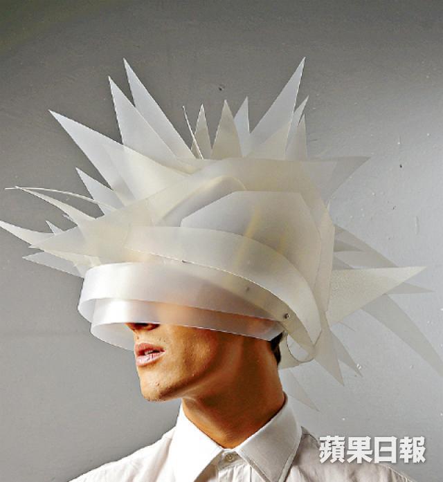 Nick 的作品會用上不少非傳統做帽的物料,如塑膠、纖維紙甚或是戶外廣告專用的布料等。與Jaycow以木帽模作為製作技巧,他主要是Cut & Sewn(裁剪和縫製)為本,更不時用上螺絲及膠槍作為縫合物料。