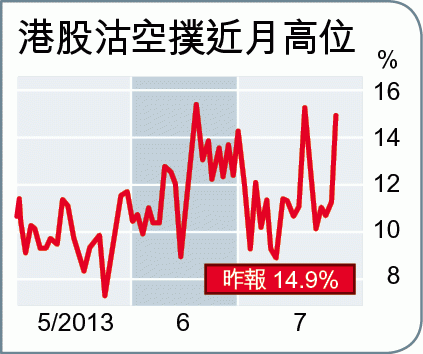 內地拆息回升,港股隨即有負面反應,於大市交投僅421億元之下,港股沽空比率急升至14.9%,為千禧年以來第三高水平。