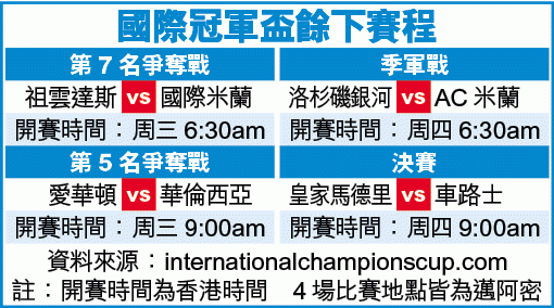 車路士與摩連奴重逢後,所向無敵;周日於紐約的國際冠軍盃4強賽事,以2:0擊敗AC米蘭,晉級決賽,保持熱身賽全勝。車路士將於周三在邁阿密與皇家馬德里爭逐錦標,換句話摩帥離開皇馬短短幾十天便倒戈相向。