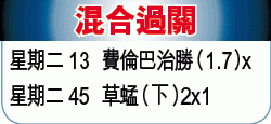 同日瑞士球隊草蜢主場對法甲的里昂,後者於首回合憑比斯華攻入致勝球而贏1:0,可帶着優勢作客瑞士。但草蜢今仗亦可強陣上場,主力如門將布基、中場沙拿迪及加斯等都可披甲,有力保不敗,主場兼受讓平/半,當取下盤。