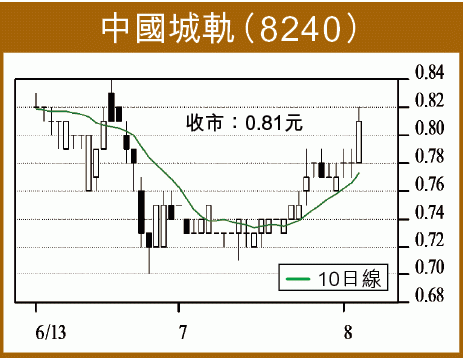 另一個可博的行業是鐵路相關股,中國南車(1766)上周出現一支大陽燭突破後,近兩日股價在高位整固,昨日中鐵建(1186)亦有勢頭破近期高位,都是有機會短炒的。同業中,細細粒的中國城市軌道(8240)市值僅7億銀,如鐵路股當炒或者可跟炒一轉。