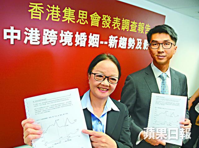 政府統計處資料顯示,港男娶「中女」(中國女子)去年有20,161宗,較1986年的15,776宗多28%,高𥧌是1997年28,309宗;但港女嫁「中男」同期則升九倍,由675宗增至去年歷史新高6,785宗。97年至去年中港婚姻接近39萬宗,每年約半數新婚夫婦屬於這類個案。