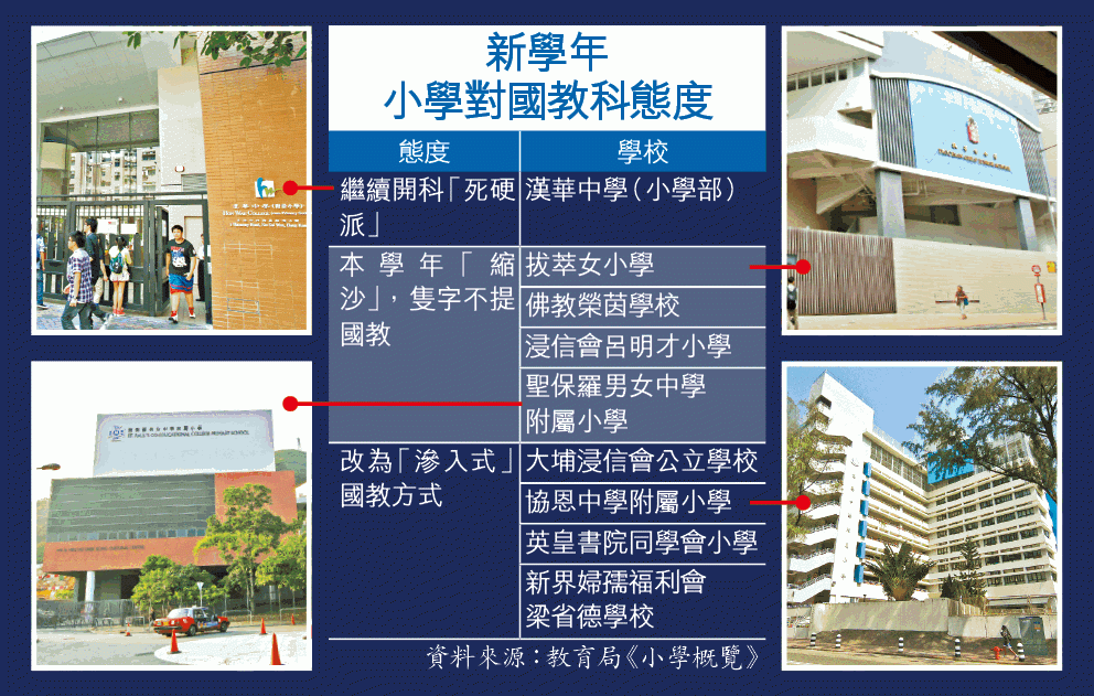 不少名校去年在概覽列明推行國教,今年卻隻字不提。傳統名校如拔萃女小學和聖保羅男女中學附屬小學,上年度在概覽介紹國教推廣方式,今年則全無國教字眼。聖保羅男女中學附小由「透過全校培育推行德育、公民及國民教育」,改為加強品德教育。去年揚言開科的佛教榮茵學校本學年也把課程改為「德育及公民教育課」;沙田地區名校浸信會呂明才小學本學年逢周五早上設半小時公民教育環節,代替國教科。