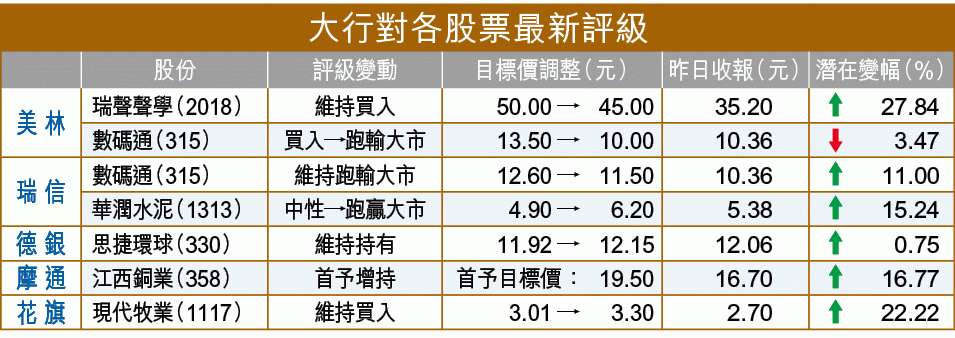 而摩通則出報告推介江西銅業(358),摩通指江西銅業去年生產110萬噸精煉銅,佔中國總生產19%,該股有「乾淨」的資產負債表及低成本本地經營,故在近期的下跌周期中,表現遠較之前好,該股PB現為1倍,低過歷史平均的1.3倍,認為估值有支持,很可能會被大行進一步調升評級,故首予增持評級,目標價19.5元。