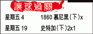 同日德乙亦有3場比賽,直播場次為阿倫主場對1860慕尼黑(球賽編號:星期五4;有線64及203台明日0:30am直播),1860對上兩場雖然都是輸波,但開季至今於6場聯賽取得3勝3負,演出算好,加上拿奧夫及基拿利等主力都可披甲,故作客下游的阿倫受讓平/半,必捧下盤。文:青蛙仔