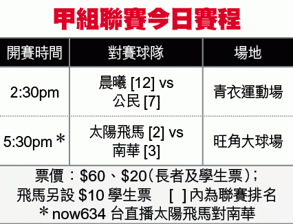 【本報訊】衞冕的南華今日在旺角場上演甲組聯賽重頭戲強陣出征,誓破來勢洶洶,兼獲巨額贊助的太陽飛馬,爭取連捷。(now634台今日5:30pm直播)