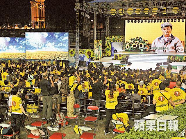 昨晚在氹仔馬場舉行的澳博11周年大型演藝晚會,有7,000名澳博員工出席,他們大多穿上黃色印有向日葵圖案的Tee恤,還有代表梁安琪候選名單編號的1字,晚會載歌載舞,香港紅星黎耀祥、古巨基、薛家燕及樂隊Mr都有演出。晚會好戲在後頭,四太上台致辭表示秉承何鴻燊教誨,要為澳門及國家爭取連任,賭王更現身大屏幕,督促全場員工,「蛇王都要去投票畀梁安琪」。四太則七情上面,感慨表示因為工作與參選而未能兼顧家人,這時其兒子何猷亨穿上1號黃戰衣上台,場面扣人心弦。