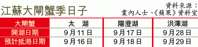 另一間本港零售商老三陽,目前僅購入半噸大閘蟹,董事總經理祁玉鳳指,今年太湖天氣長期炎熱,大閘蟹仍未換殼,十隻蟹中揀不出一隻合適靚蟹,預料初期大蟹價格高一倍,要待10月後蟹價才回落至正常水平。