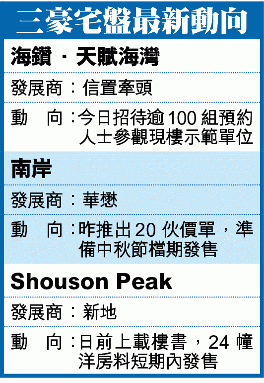 至於洋房新盤壽臣山Shouson Peak,新地日前上載樓書,尚餘24幢可出售。三盤共237伙隨時出擊齊發。